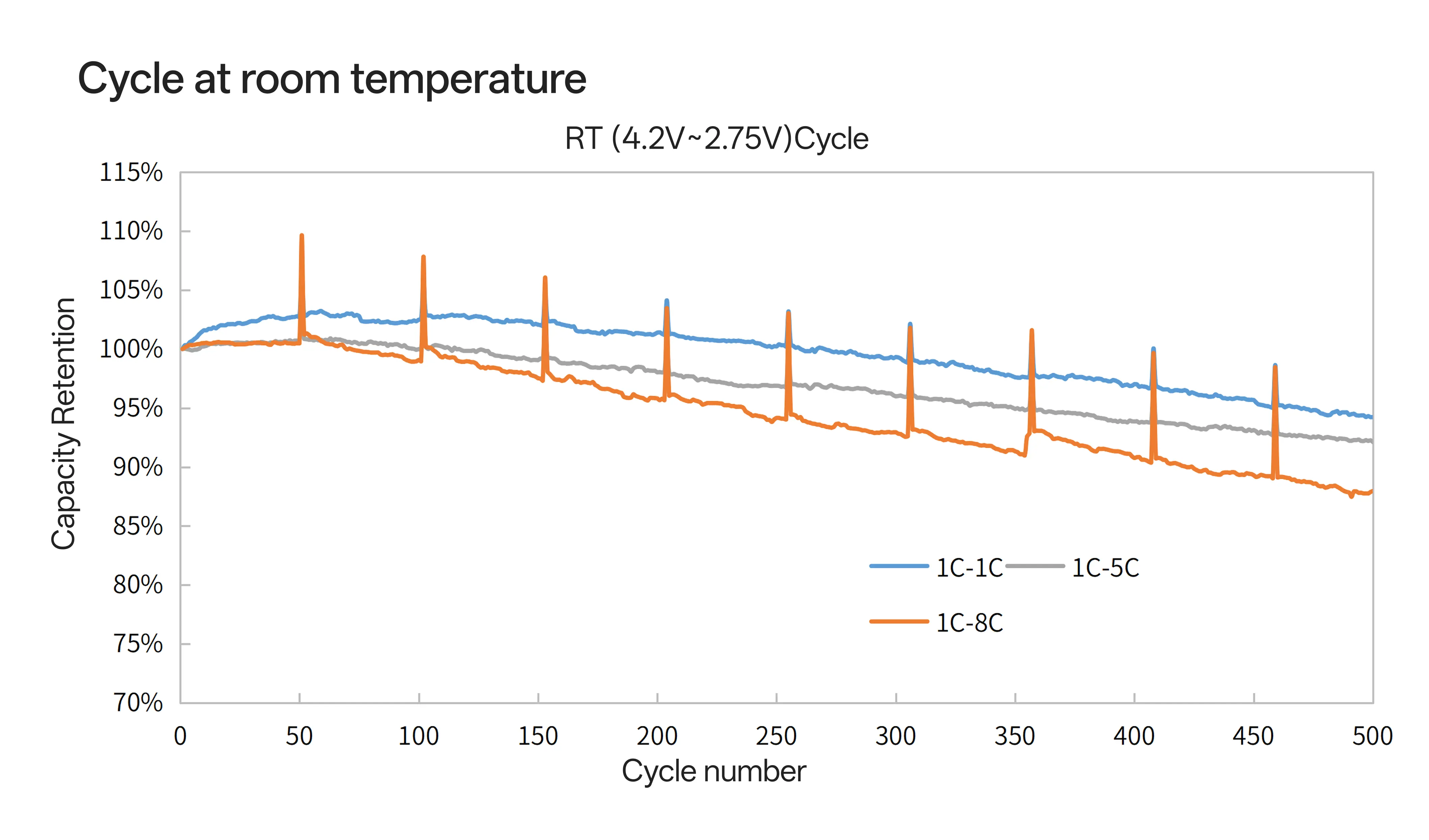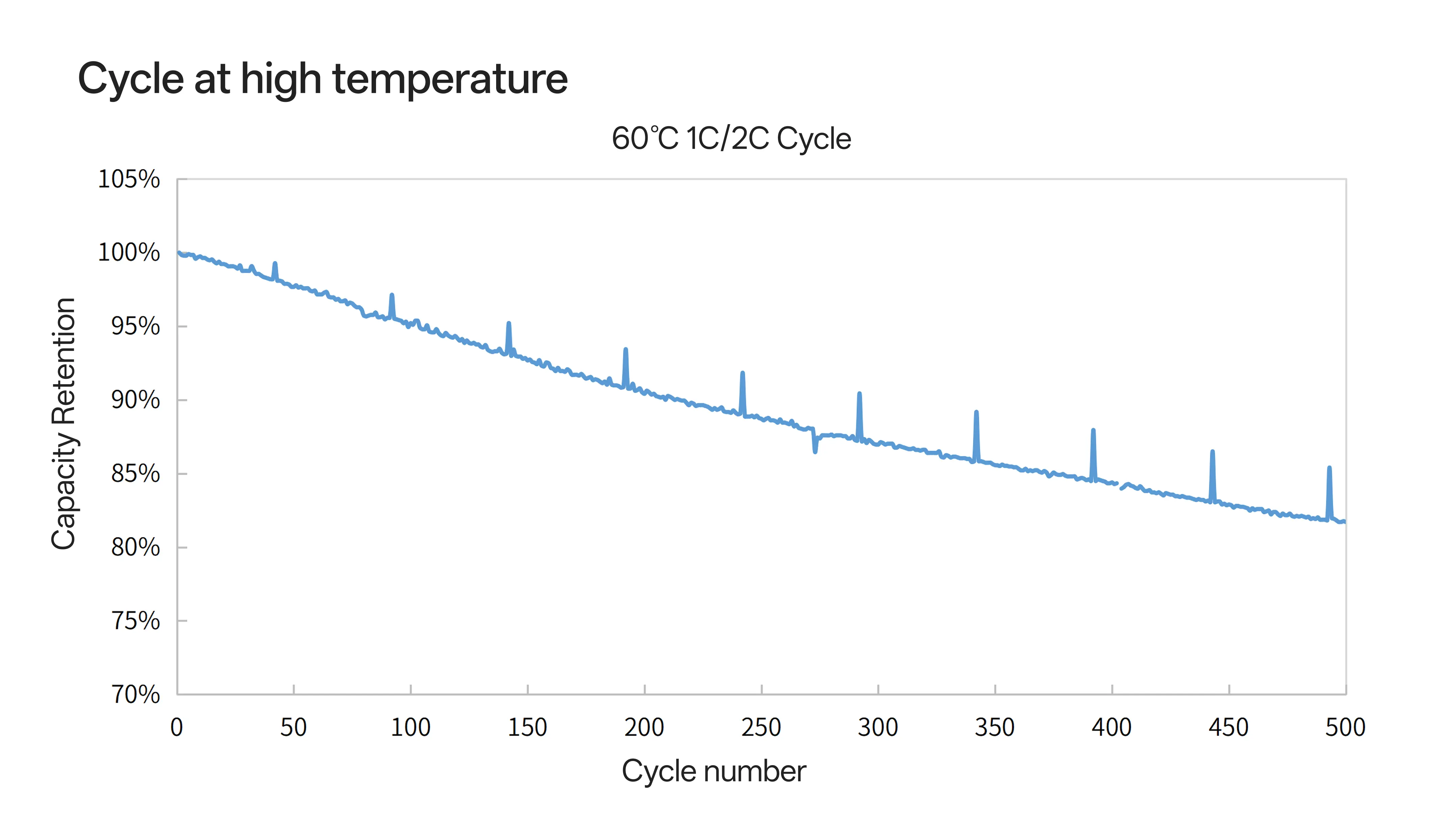 Retain 75% capacity after 1C/2C 500cycles at 60℃.