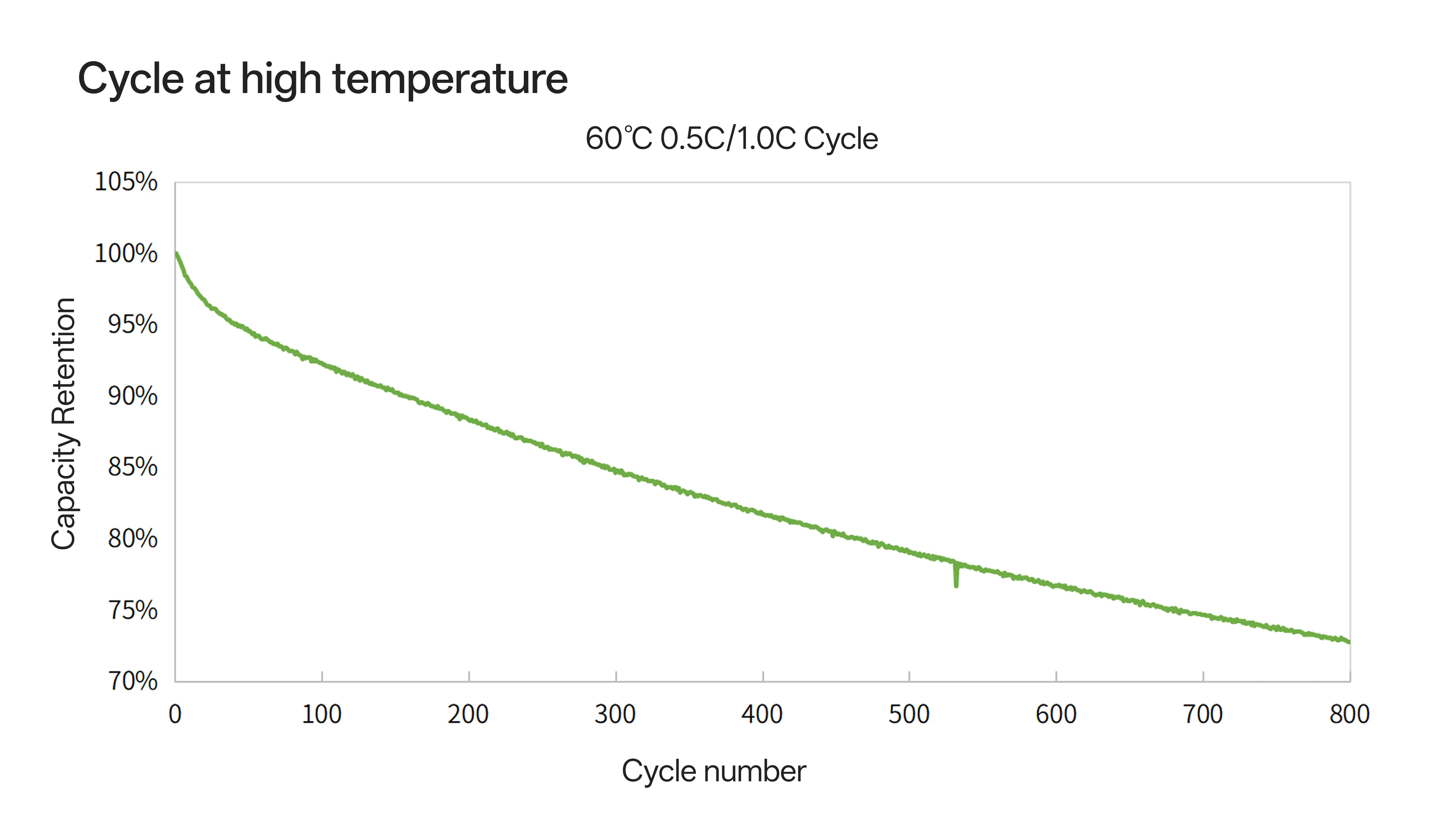 Retain 70% capacity after 1C/2C 800cycles at 60℃.